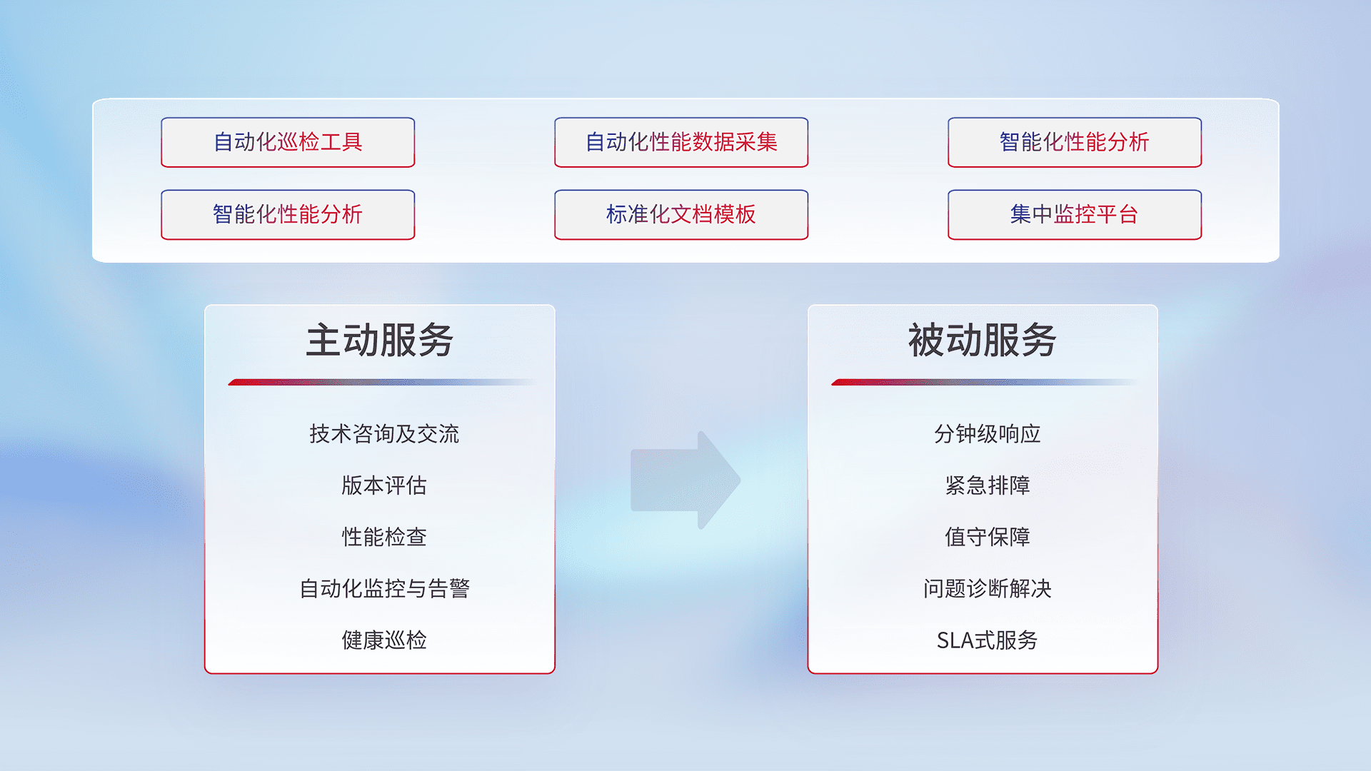 智能化工具和标准化文档,,,保障服务质量,,提供主动服务(包含技术咨询、、版本评估、、性能检查、、、自动化监控与告警、、、健康巡检)和被动服务包含(分钟级响应、、、紧急排障、、值守保障、、问题诊断解决、、、SLA服务)。。。