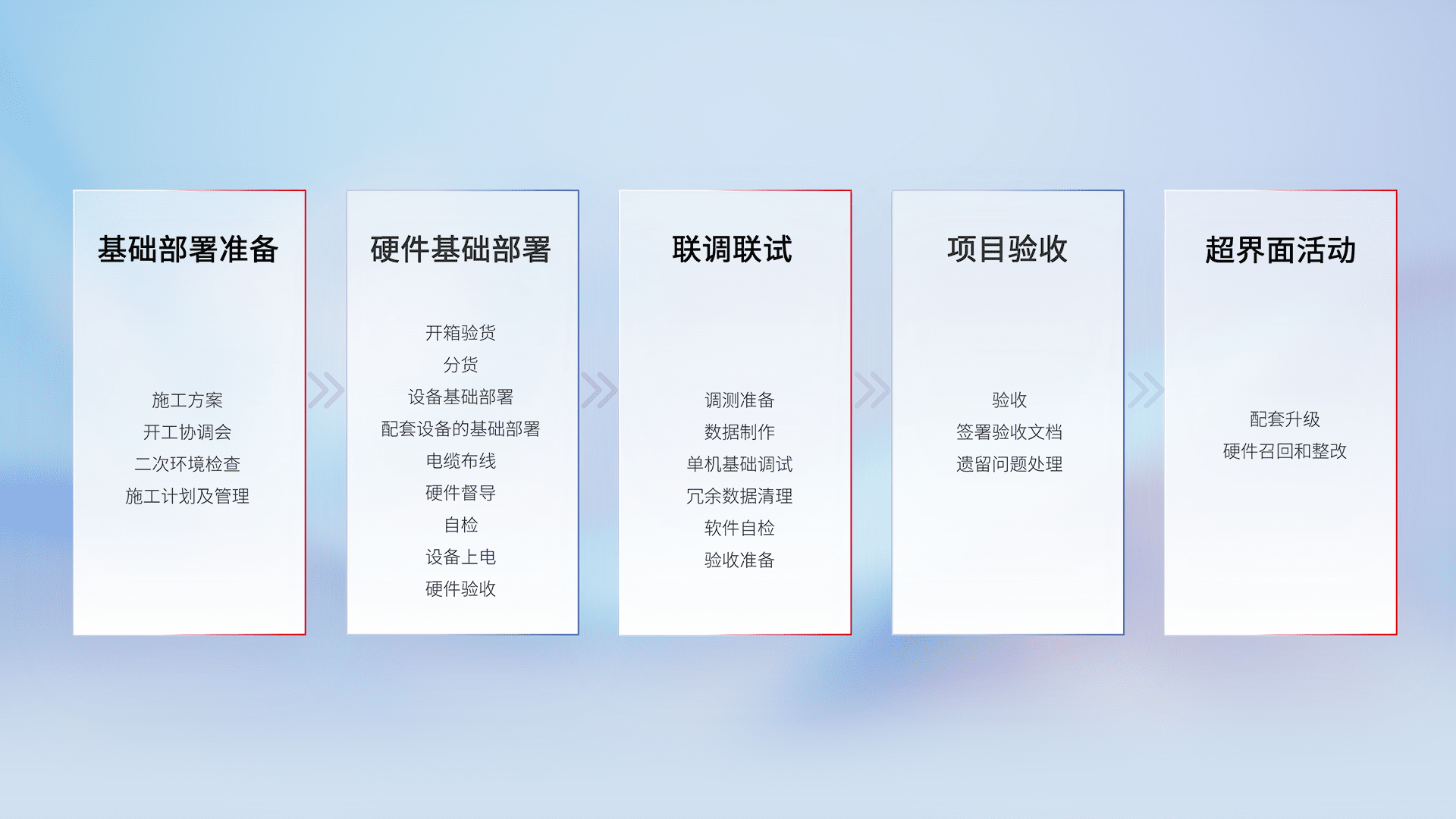 从基础部署准备、、、硬件基础部署、、、、联调联试、、、项目验收、、越界面活动的全过程可追溯,,,保证施工质量和进度。。。